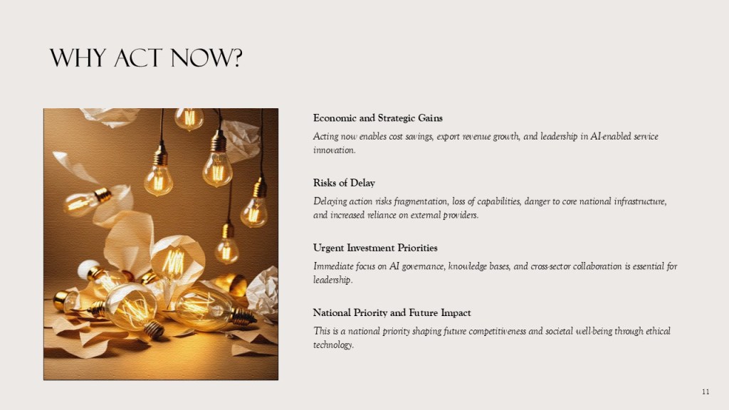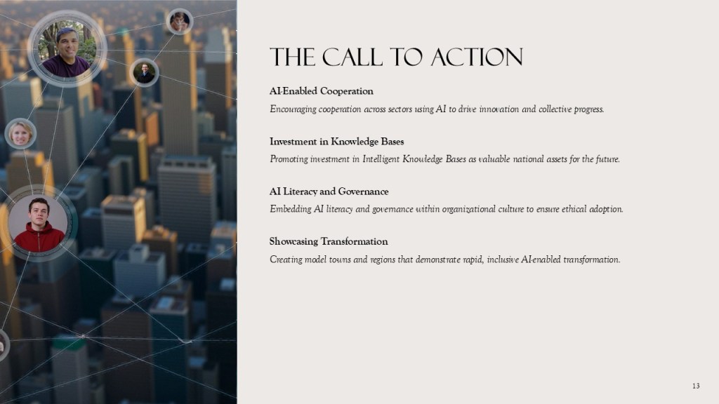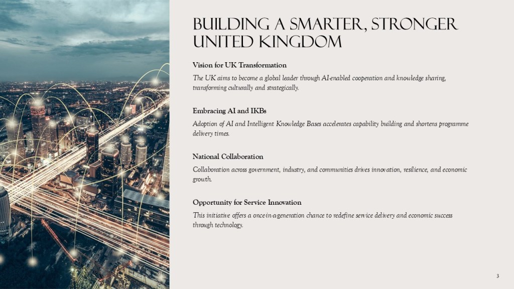 The United Kingdom has a once‑in‑a‑generation opportunity to build a smarter, stronger future by embedding AI and Intelligent Knowledge Bases into its national fabric—accelerating innovation, rejuvenating public services, and empowering local economies. Success depends on overcoming fragmented strategies and siloed thinking by treating knowledge and AI as critical infrastructure, embedding resilience by design, and ensuring ethical governance. By acting now, the UK can harness AI’s transformative power while proactively managing risks, securing national infrastructure, and positioning itself as a global leader in inclusive, future‑ready innovation.