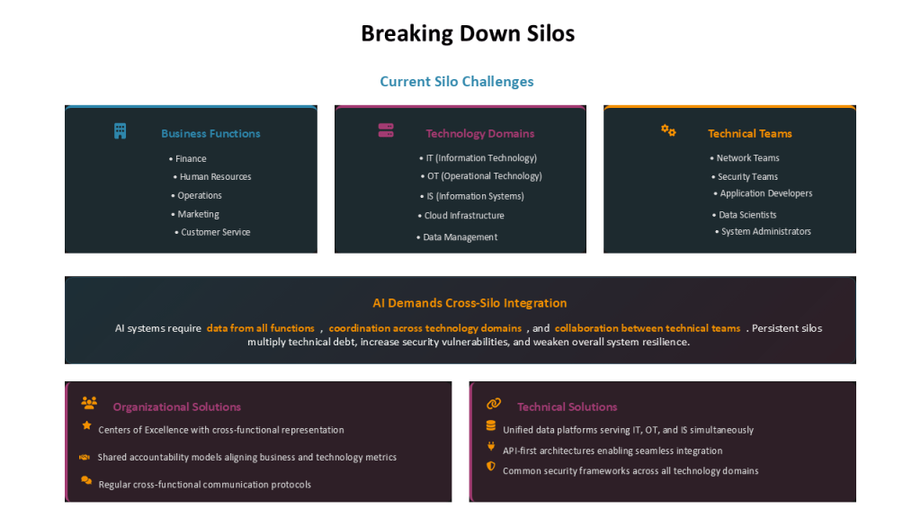 We have considered Ai implementation and resilience from a Management and governance framework perspective. We now need to consider them from a Systems perspective where we look at business and technology systems, functions and processes. We also need to consider silos where there is insufficient sharing of information and poor cooperation. In business’s these are generally between business functional areas. This is also true of IS systems teams. Within IT this is generally between IT, OT and IS. It is also common across IT technical areas. AI cuts across all areas and requires communications across all silos Business and Technology resilience also needs to work across all areas. Can you provide a briefing note on this.