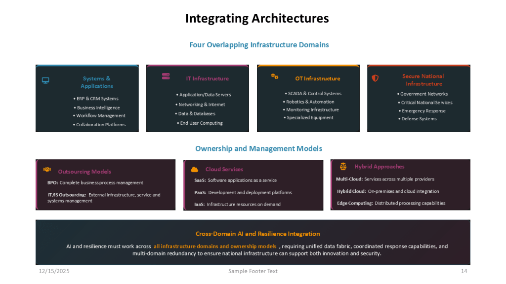 With technology Infrastructure we generally spilt it into three overlapping categories of: systems and applications, IT Infrastructure, OT Infrastructure and Secure national Infrastructure. We also need to consider ownership and management including BPO, SaaS, PaaS, IaaS, IT and IS outsourcing. Technology can be categorised as application and data servers, networking and internet, data and databases, end user computing, monitoring and control infrastructure, specialised infrastructure such as robotics. AI and resilience need to work across some or all of these domains. Can you create a briefing note on this.