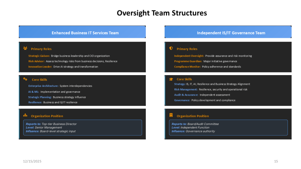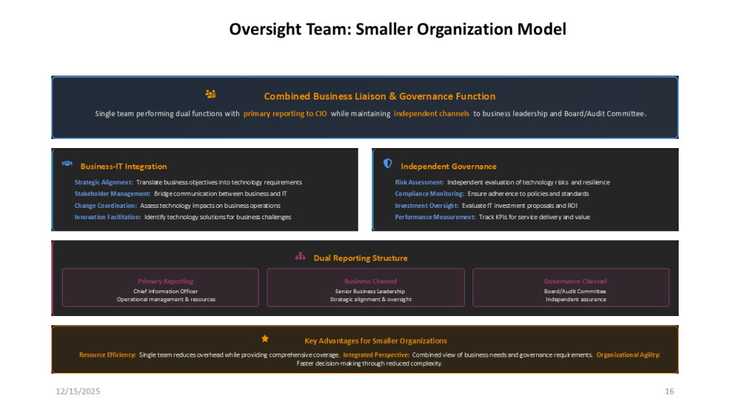 Can we now consider a smaller organisation where an oversight team undertakes a combination of the two roles, the business team and the CIO team. They will report to the CIO but act as an independent group with additional reporting links into the business. Can you outline the role