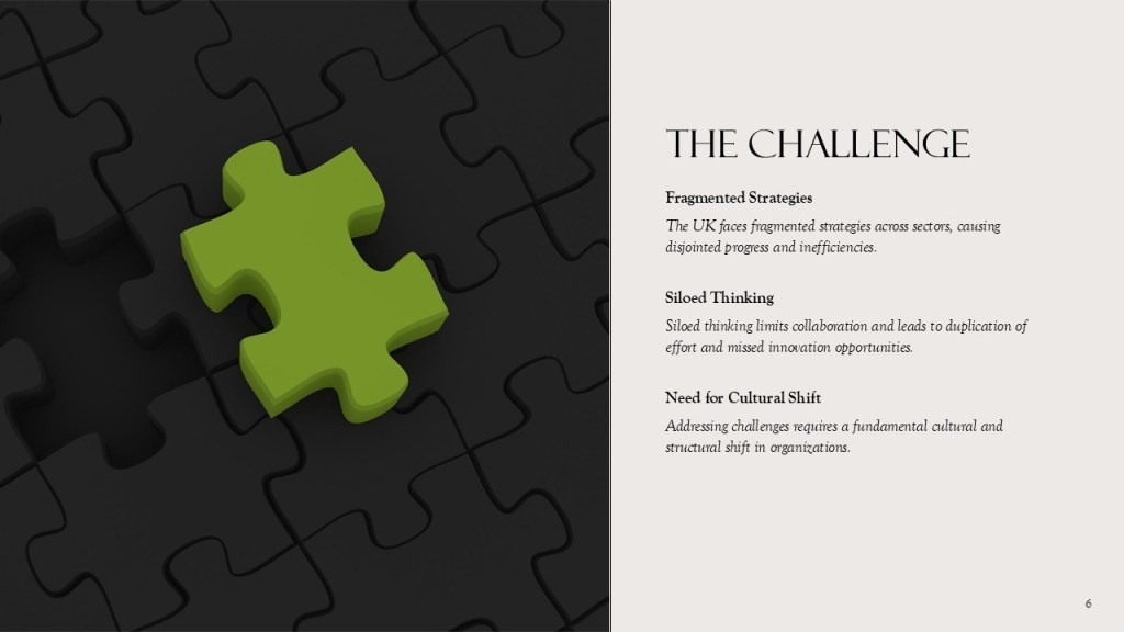 The presentation is a call to action for transforming the UK through the implementation of AI. It highlights the need for collaboration and sharing knowledge. However, there are challenges in how Information Systems (IS) and Information Technology (IT) have developed over time, especially concerning Business Alignment, Strategy, Innovation, Governance, and Technical Silos.