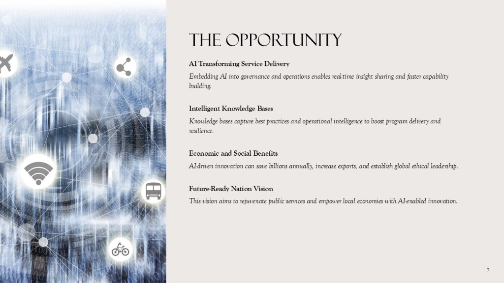 The above documents were used by AI to create a speech for a range of audiences, including for UK Ministers. This was then used to automatically create a slide pack covering the implementation of AI to help in Building A Smarter, Stronger United Kingdom.