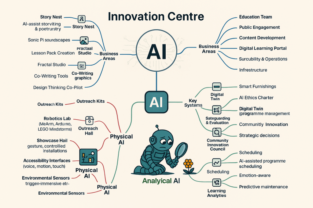 We have now completed this phase of the Innovation Centre Programme. Given the technical nature of the programme we will use an Agile approach, but will still need to use cut down versions of MSP for Programme Management and ITIL for technical infrastructure. We will also be producing Business Models, Process Models and Functional Models. We also need to be innovative and represent AI, in all its forms, within these models. However, the key model that is missing is an overall AI model, which gives a pictorial view of AI in the Innovation Centre system. We could show Generative AI, Physical AI and Analytical Algorithms in different colours. I see a top level diagram, the size of A0 paper, on a wall where we can see a representation of the Innovation Centre with AI clearly shown. I usually create these types of diagrams for larger programmes. I like to have one overarching diagram that could include a combination of Business Functional Areas, Top Level Processes, Geography of sites, Key Systems, and Key Infrastructure. We now need to create this pictorial view clearly showing the use of AI. The aim is highlight the ubiquitous and diverse use of AI within the Innovation Centre. Ultimately there will be a number of diagrams showing the increased use of AI as the Innovation Centre evolves over time. Can you help in designing this high level diagram. A Mind Map would be appropriate.