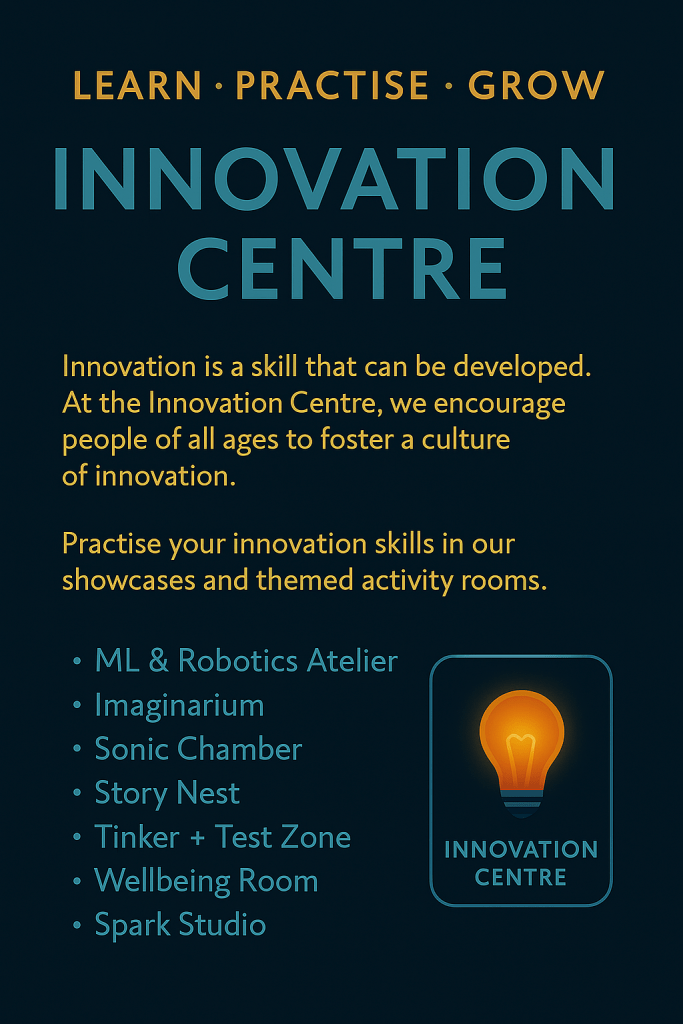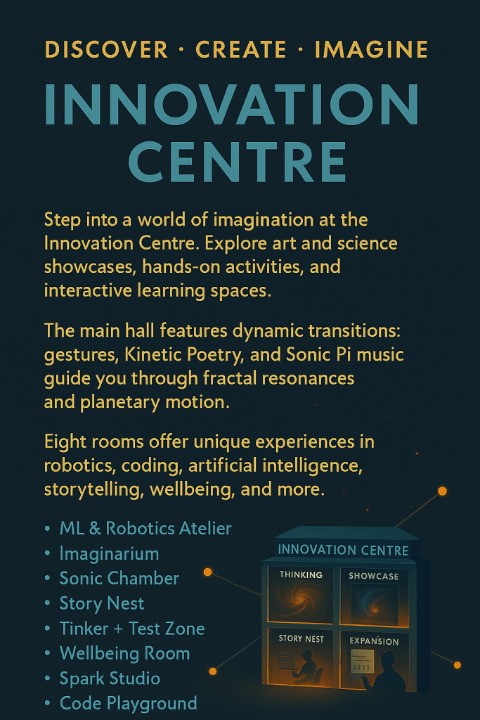 The posters showcased here were generated using AI, guided by the detailed conceptual designs of the Showcase and Innovation Rooms developed throughout the AI conversation. While grounded in the core principles of STEAM—Science, Technology, Engineering, Art, and Mathematics—the Innovation Centre places Artificial Intelligence at the heart of its mission. AI acts not only as a topic of exploration but as a connective force, supporting all other disciplines. Together with Art and Robotics, AI forms the Centre’s central triad of creativity and technology.