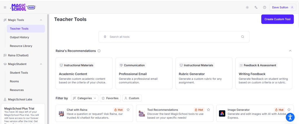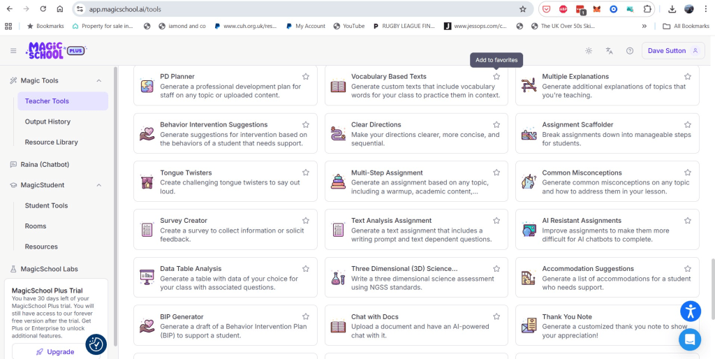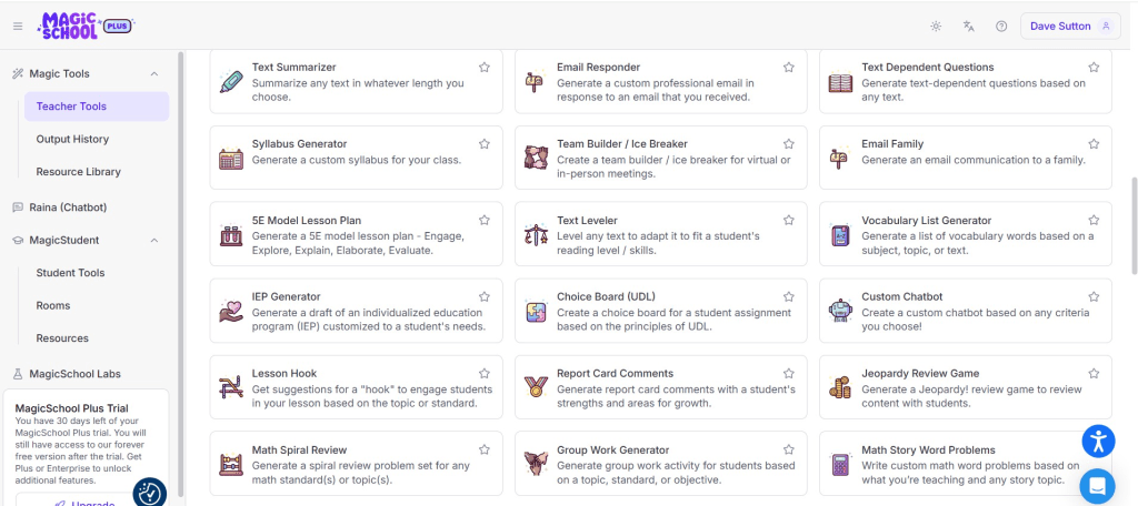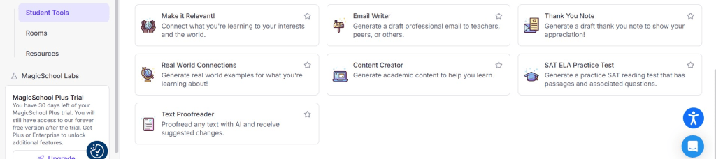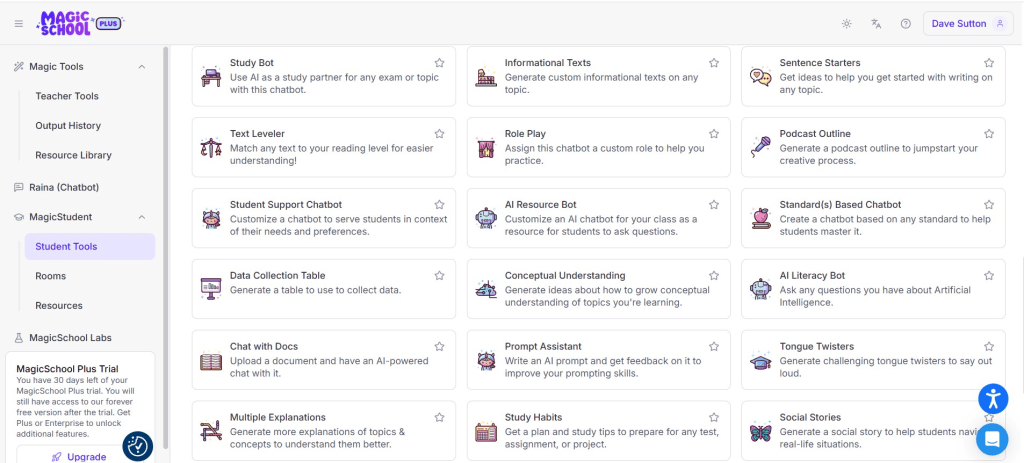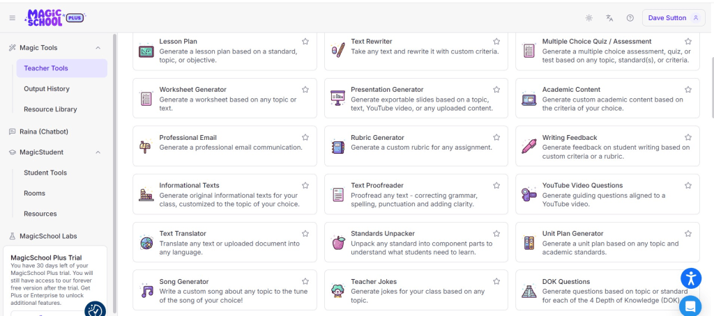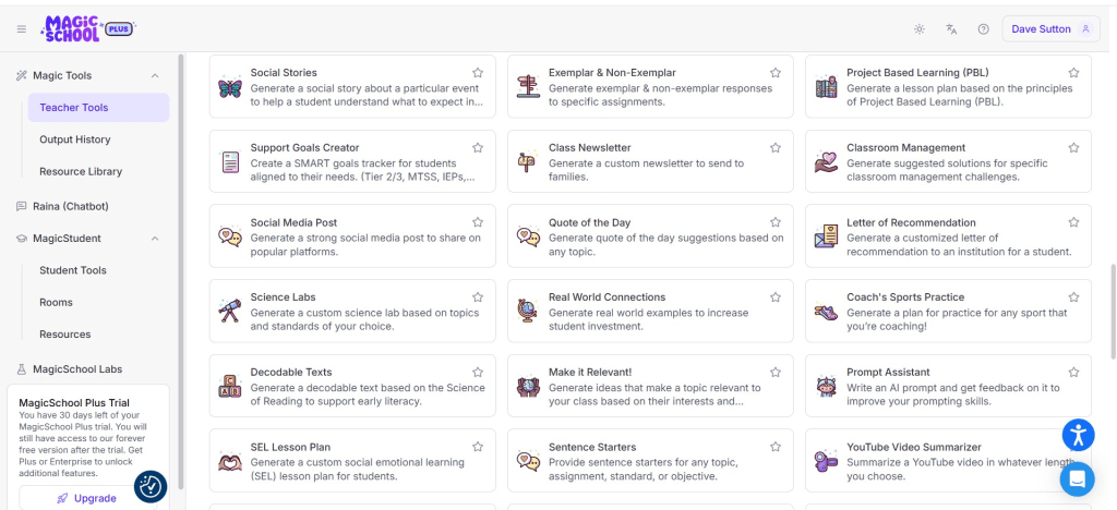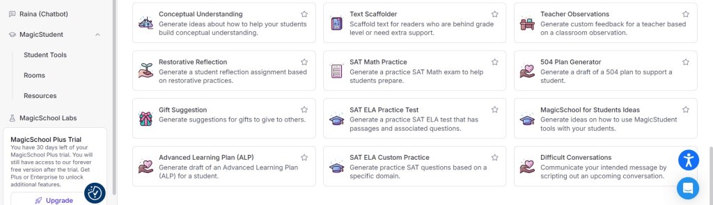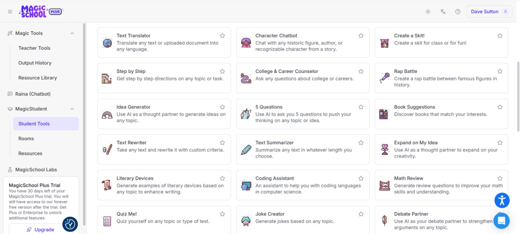 Magic School AI Tools A few screen shots from Magic School’s website showing the areas they cover Teacher Tools Pupil Tools