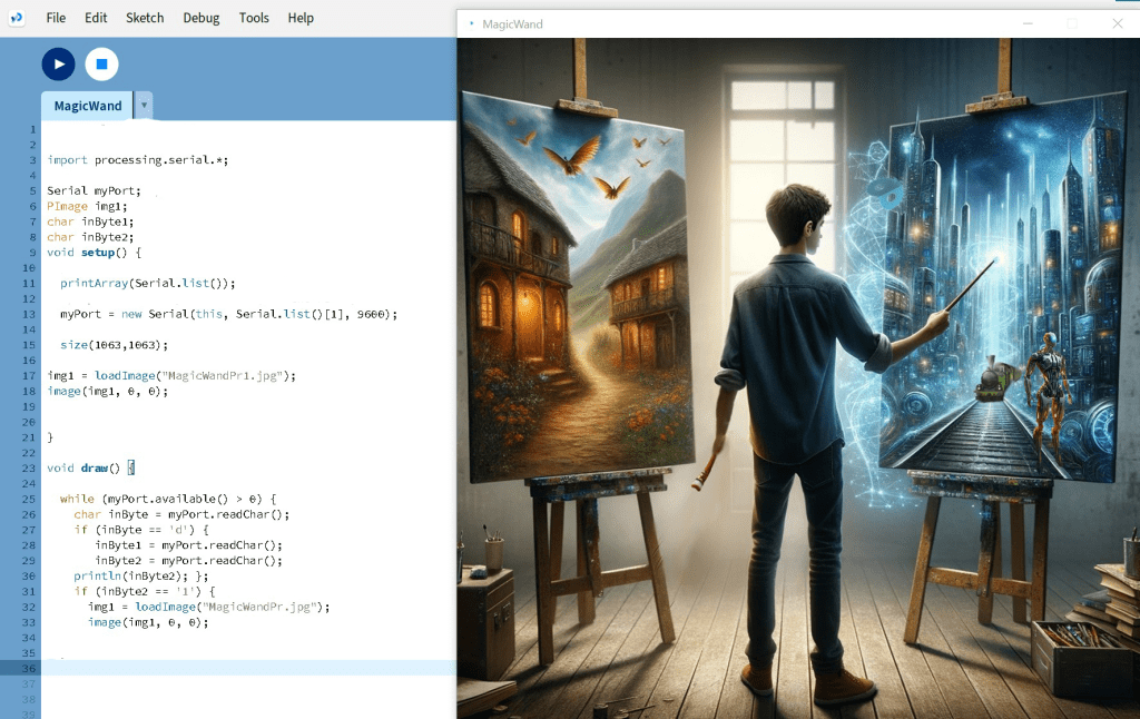 Once the wand was completed, I had the idea of using it to modify an AI generated image. This could be done by reading the numbers using a language designed for artists (Processing). However, first to create an image and story.