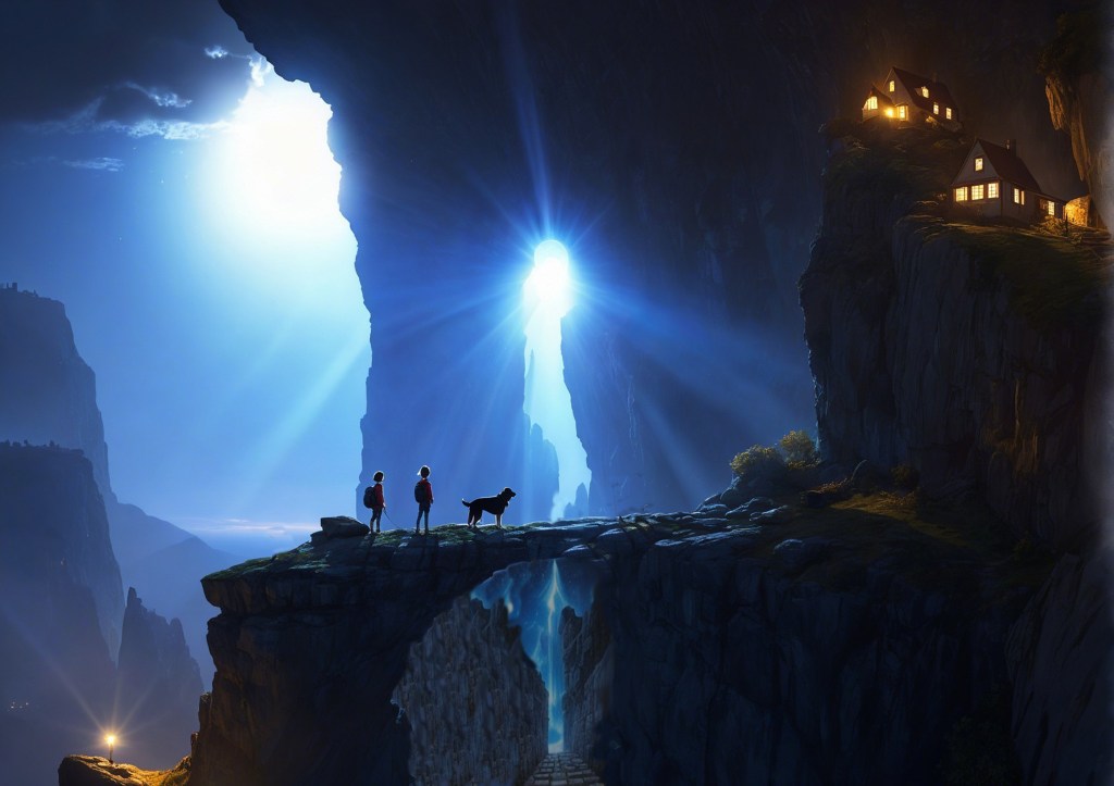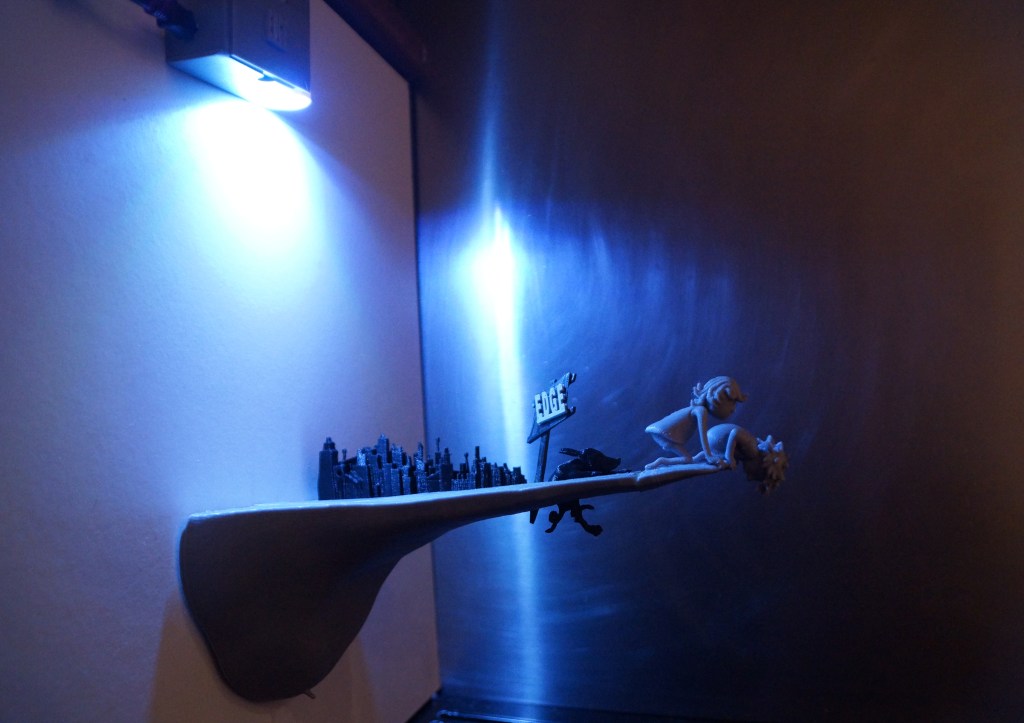 The book on the bookshelf “The Game of Portals” started life as a 3D printed model and computer components that made up “The Edge”. Children and a dog looking over the edge of a cliff. This became a story and a set of images. The model and computer controlled lights where photographed to create a starting image. “The Game of Portals” is another project.