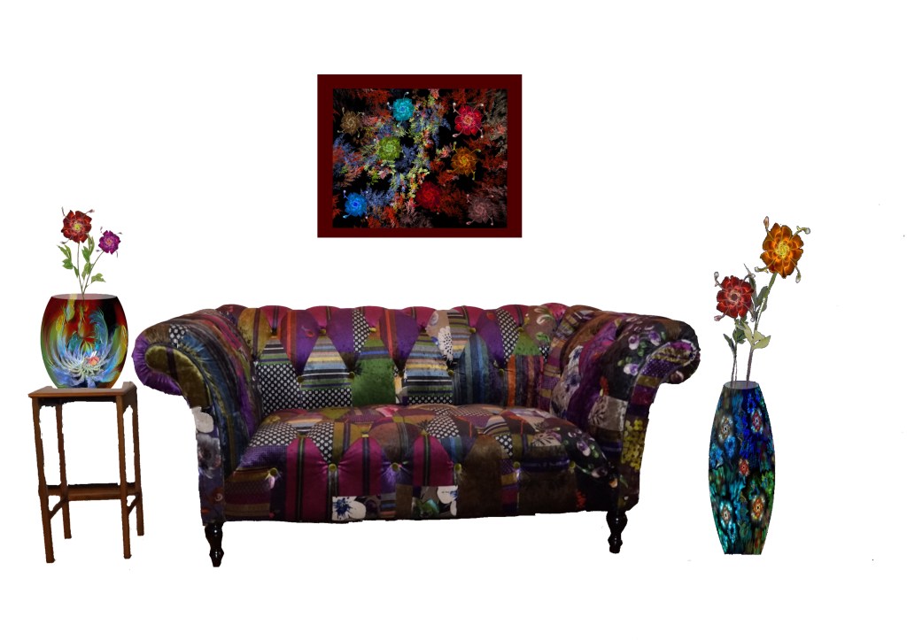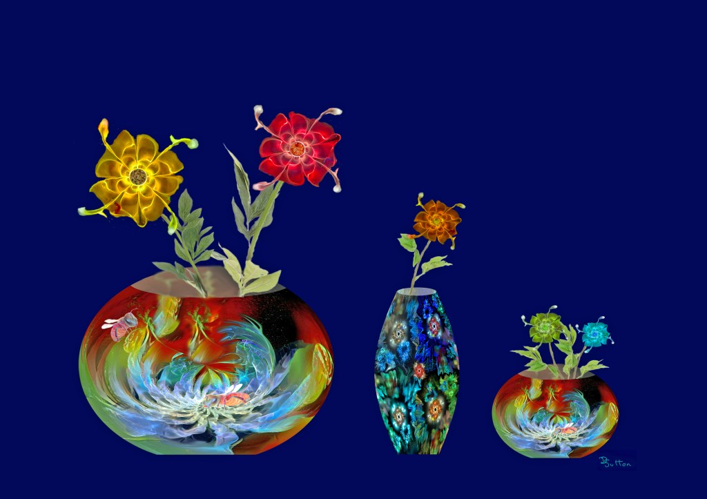The vases and flowers started as complex fractal images. You can see the difference between the fractals and a flower on the right hand vase.