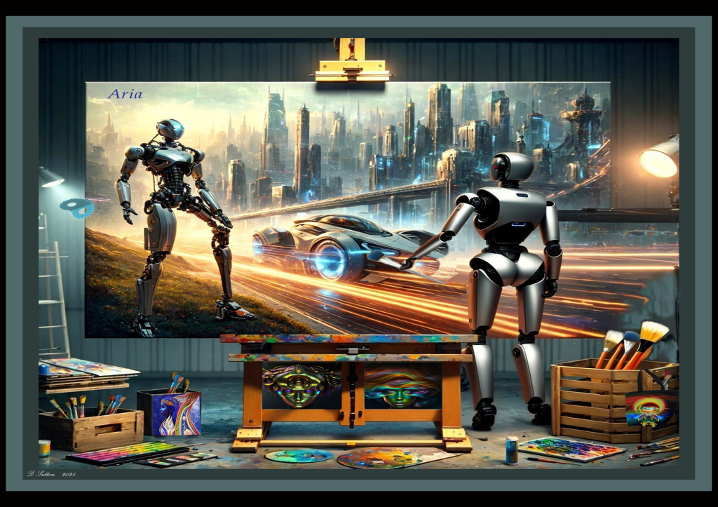 Although many of the elements had been completed before I started the work, it was far from simple. The central image was created using AI and Digital Art, with the other elements added later. An interesting feature, not covered in previous notes, is the images of Arial within the easel. It started life as two bags I had produced. The images were merged. You can see one of the bags hanging on the brush box. Many of my stories and images include Aria in her many guises. The AI chatbot chose the name but to me it stands for AI, Art and Robotics.