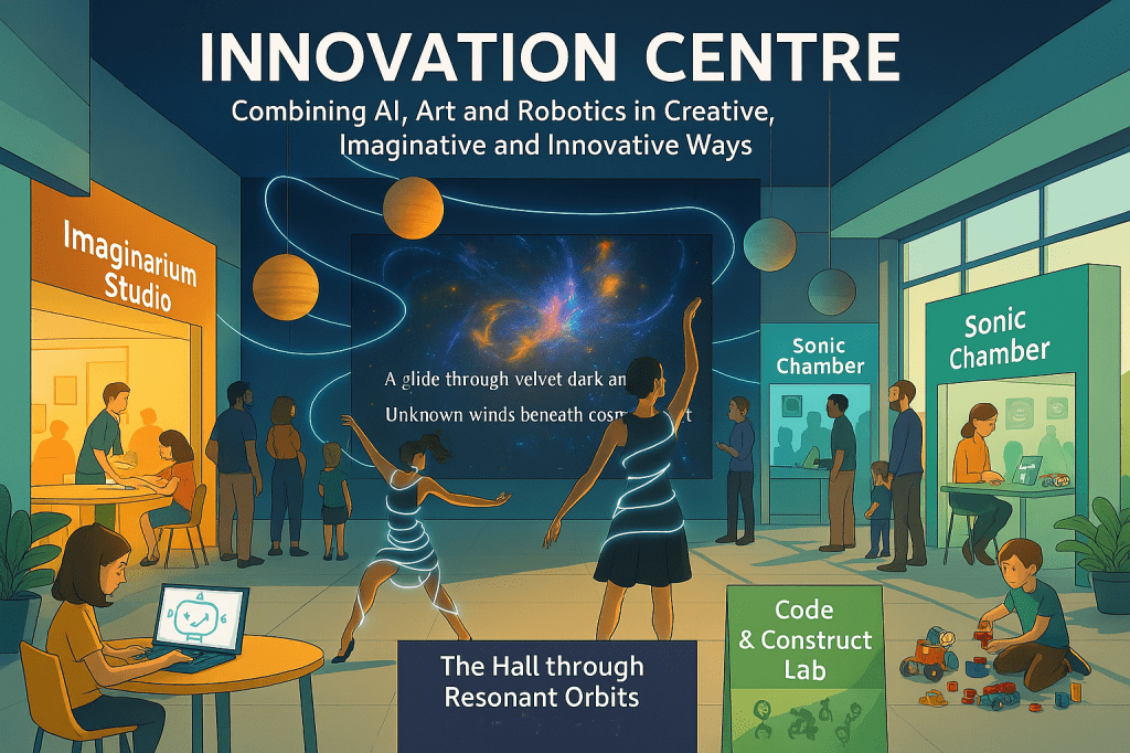 Here’s your Innovation Centre brought to life—featuring the central Showcase with glowing planets, fractal displays, and rooms of discovery radiating around it. Let’s see how your vision of creativity, AI, and storytelling shines through.