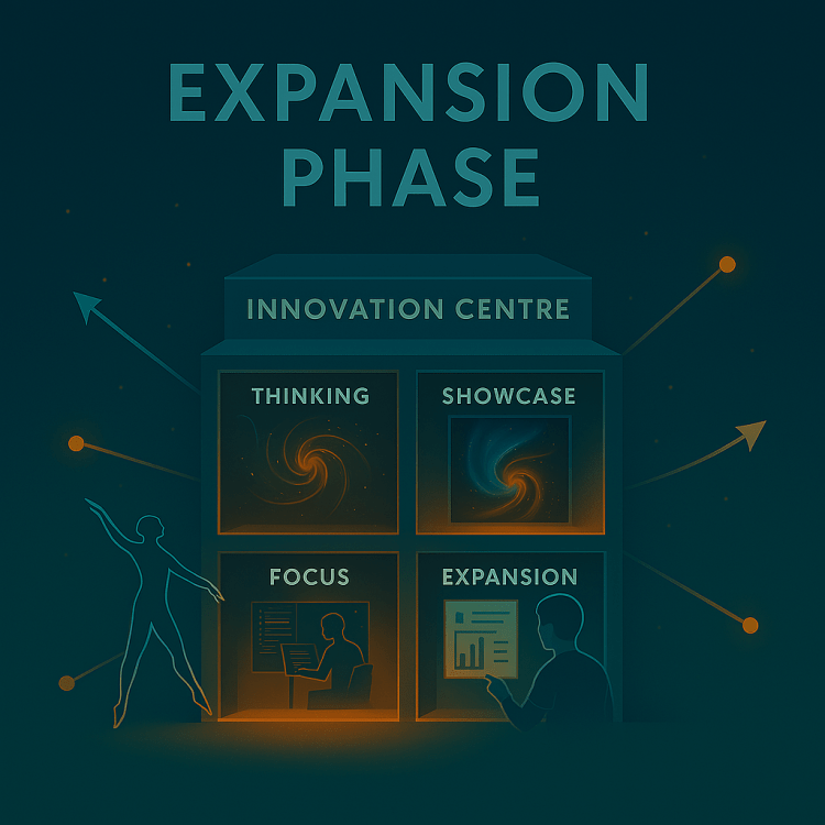 Reaching this point has been quite a long journey. I want to separate the long conversation into 4 elements. Can you create a simple image for each element. They are – Thinking Phase (where we covered Vectors and Forces), Evolution Phase (where we started to consider the Showcase), Focus Phase (where we focused in on the various options and elements of the Showcase), Expansion Phase (where we expanded out horizon and considered the wider Innovation Centre)