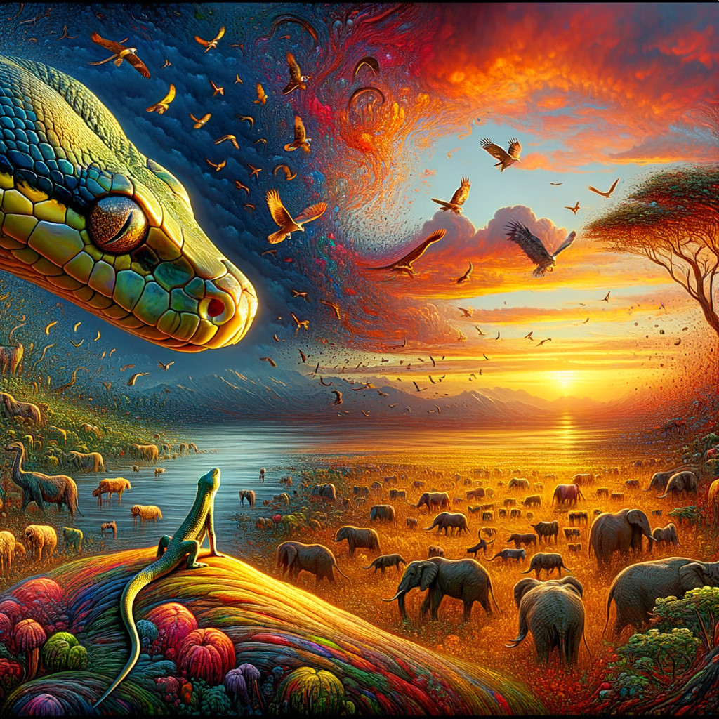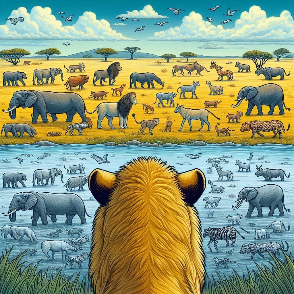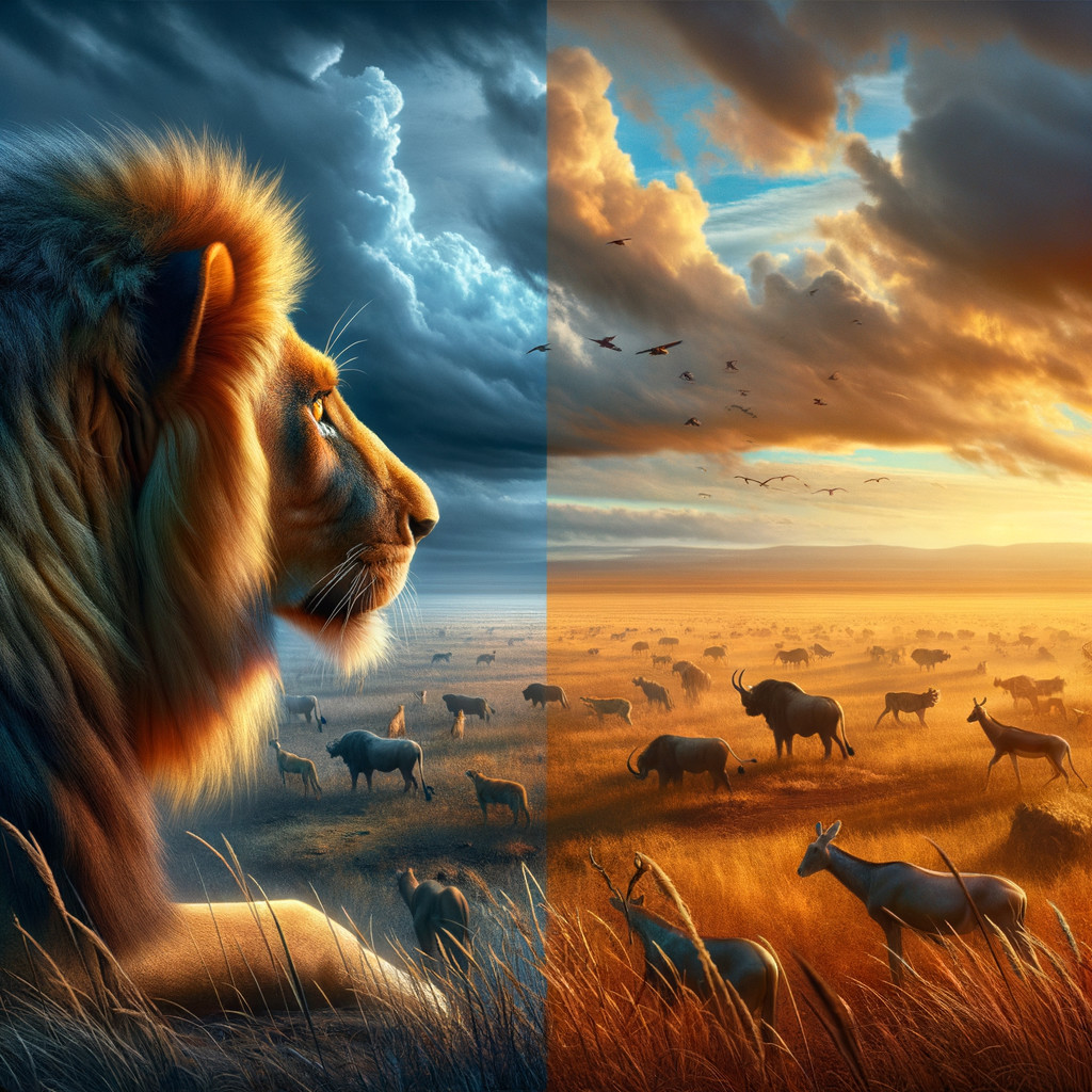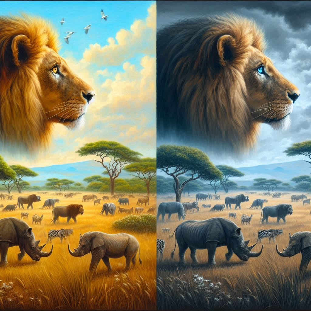 A realistic painting of a lion looking across the savanna, at many different animals. The scene is shown twice, one with the colours a lion sees, and one with the colours a human sees. (Created using Microsoft Image Creator)