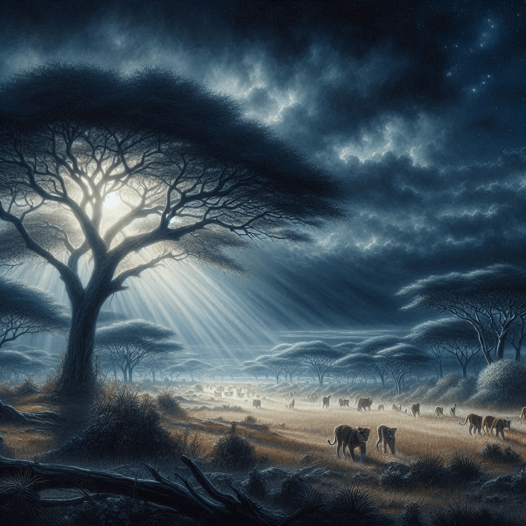 A realistic painting of the savanna at night, as seen by a lion using his night vision. (Created using Microsoft Image Creator)