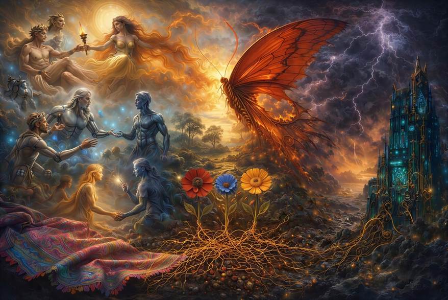 The first root is a fable: two primordial entities, A and I, who between them shaped everything that has ever been made by human hands or minds. Their tension is not a problem to be resolved. It is the engine that drives creation forward.