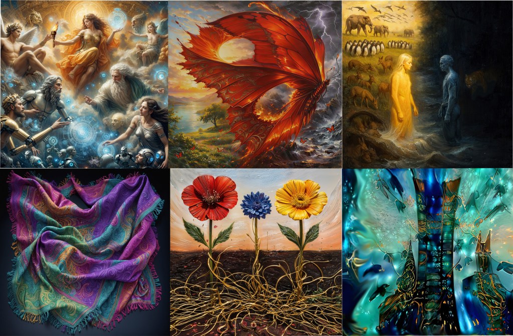 The image evolved from the story, just as the story developed from earlier images, with both constantly influencing one another. The same methods used to create the story were applied to the image. Although AI generated the final image, its components were shaped through various disciplines and extensive effort over time. Art, computer science, coding, AI, Chaos Theory and storytelling all played their part.