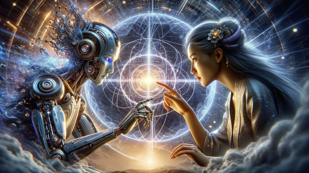 I’ll just cover the first image which was shown as people entered the room. I thought it would be interesting to illustrate how far Generative AI has come over the last year. I created the image and then asked AI to describe what it saw. It wasn’t what I was thinking but illustrates how AI interprets an image. “A futuristic scene depicting a robot and a woman reaching out to each other, surrounded by ethereal light and swirling energies, symbolizing the connection between technology and humanity”. Interesting !!